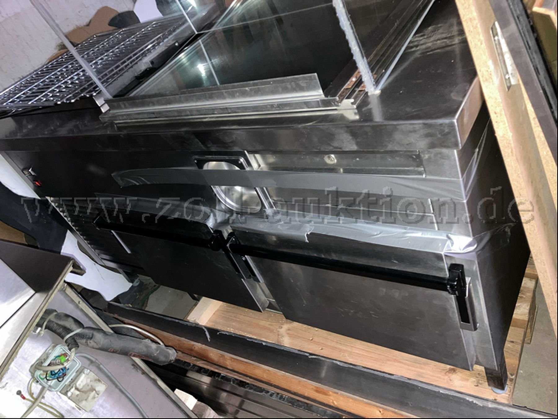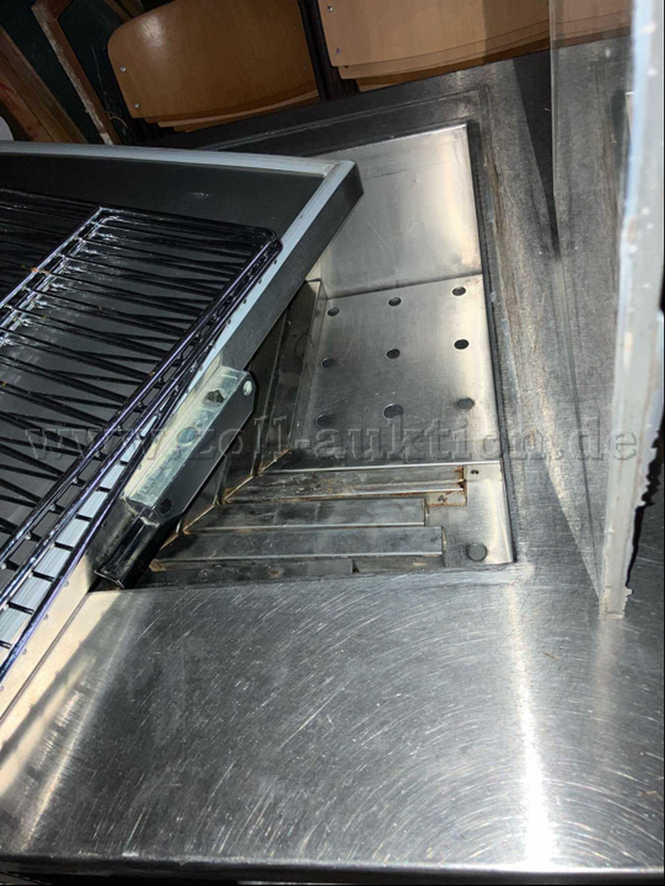 Auszugsweise Beschreibung: Hersteller/Vertrieb: Der Hersteller sowie die Modellbezeichnung sind hier nicht (mehr) bekannt, Firmen- bzw. Leistungslabel sind nicht vorhanden. Material: Edelstahl. Maße jeweils HxBxT = ca. 100x150x80 cm. Die Beschaffung erfolgte vor 1993 sodass heute übliche CE-Kennungen fehlen. Das Konvolut besteht hier aus einer edelstahlgerahmten Auslage (ohne Metallfüße) mit beidseitiger bruchfester Verglasung. Die beiden Unterschränke, bestehend aus einem Doppelflügelschrank (linksseitig nicht rechtwinklig, da zuvor als Anschlußseite genutzt – s. Foto/Skizze) und einem Spülbeckenschrank mit 2 untenliegenden Kühlschubfächer sind jeweils auf 10-15 cm hohen Metallbeinen (flexibel manuell einstellbar) aufgesetzt. Die einzelnen Elemente sind alt aber voll funktionsfähig. 3 separate Gitterroste bzw. Auffangschalen jeweils Metall sowie eine zusätzliche Kunststoffabdeckung für das Spülbecken (siehe Konvolutfoto). Mängel wurden hier bisher, auch im Zusammenhang mit turnusmäßigen Hygienekontrollen der Lebensmittelüberwachung nicht bekannt.