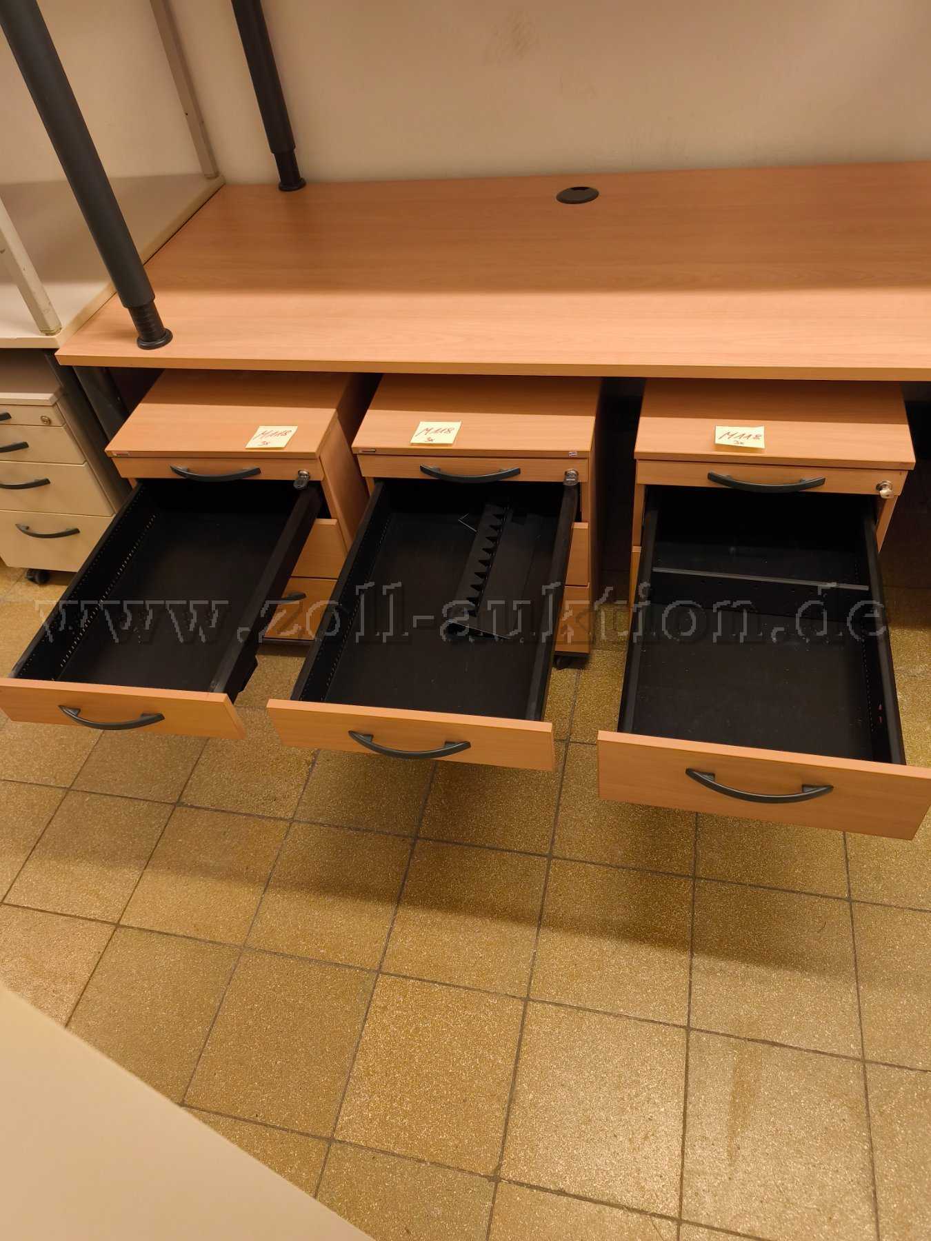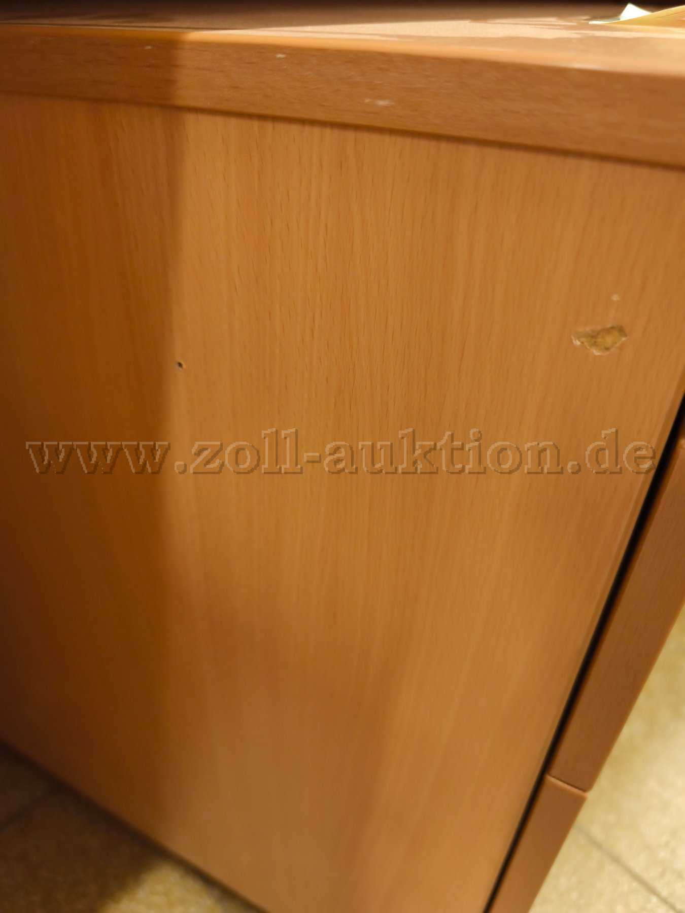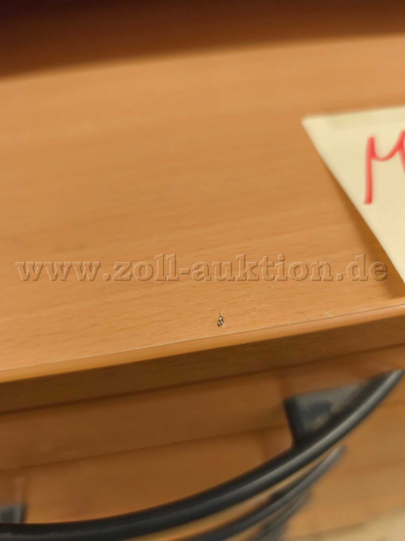 - Gebrauchsspuren in Form von diversen partiellen Abschürfungen / Kratzern / Verunreinigungen an Oberflächen. Ausbleichungen durch Sonneneinstrahlung. Weiterhin sind auf der Oberseite eines Rollcontainers sehr stark Abschürfungen und am Korpus eines anderen Rollcontainers tiefergehende Abplatzungen und ein Schraubloch vorhanden