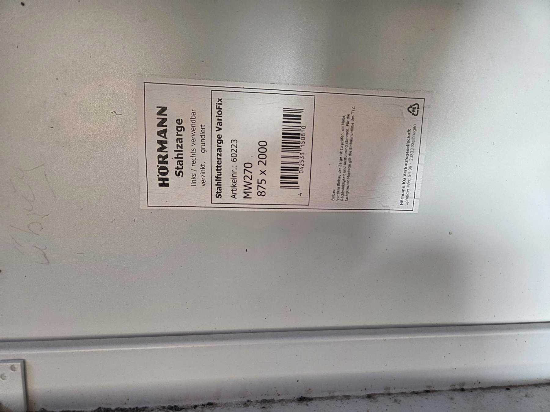 1 Stück Stahlfutterzarge VarioFix, Hersteller Hörmann, links/rechts verwendbar, verzinkt und grundiert, Artikel Nr: 60223, MW270 875 mm x 2000mm