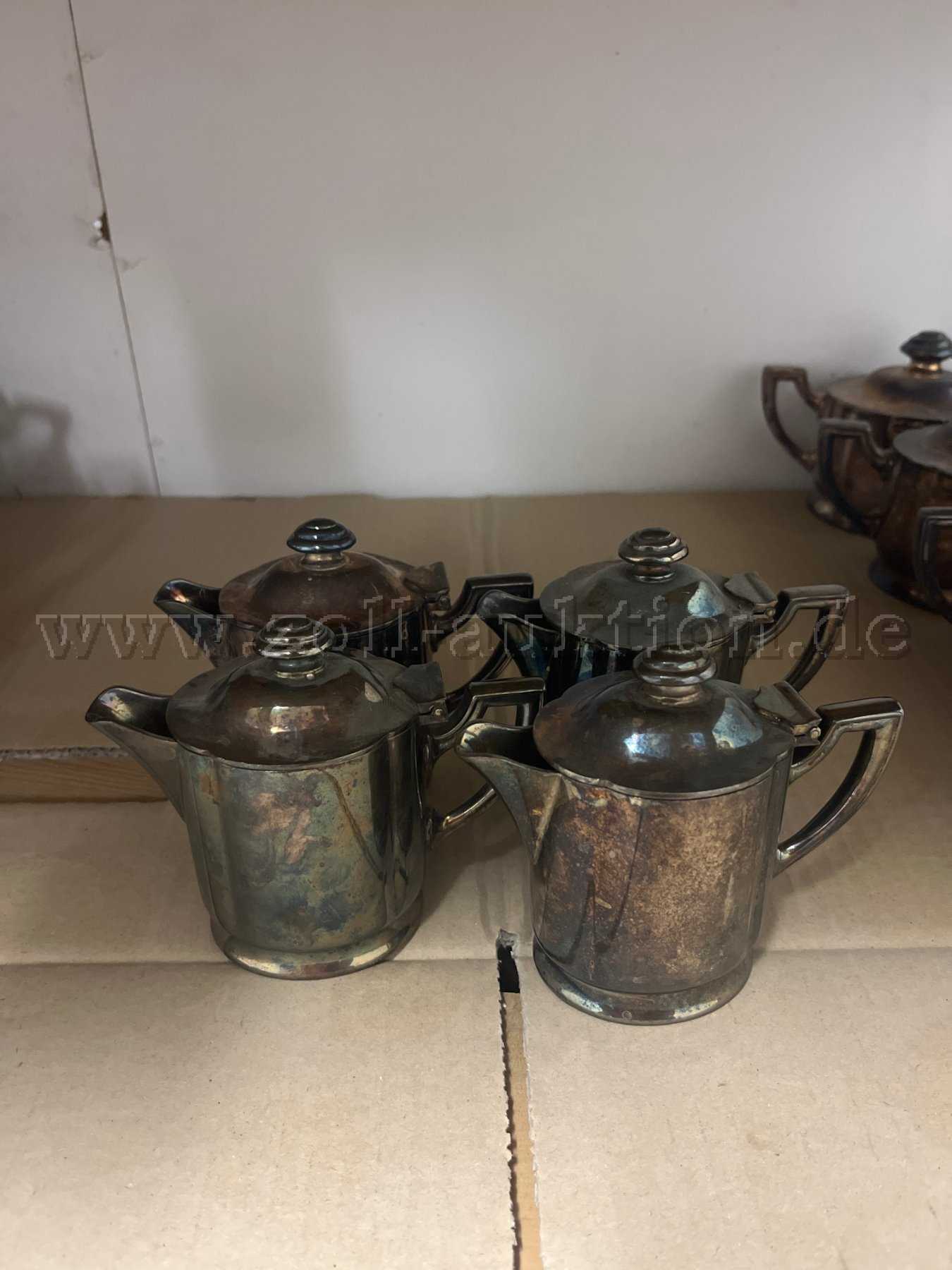 Zur Versteigerung stehen 4 Kaffeekännchen mit Deckel aus versilbertem Metall. Die Stücke zeigen sichtbare Patina/Anlaufspuren und leichte Kratzer, lassen sich aber mit Silberpolitur gut reinigen.