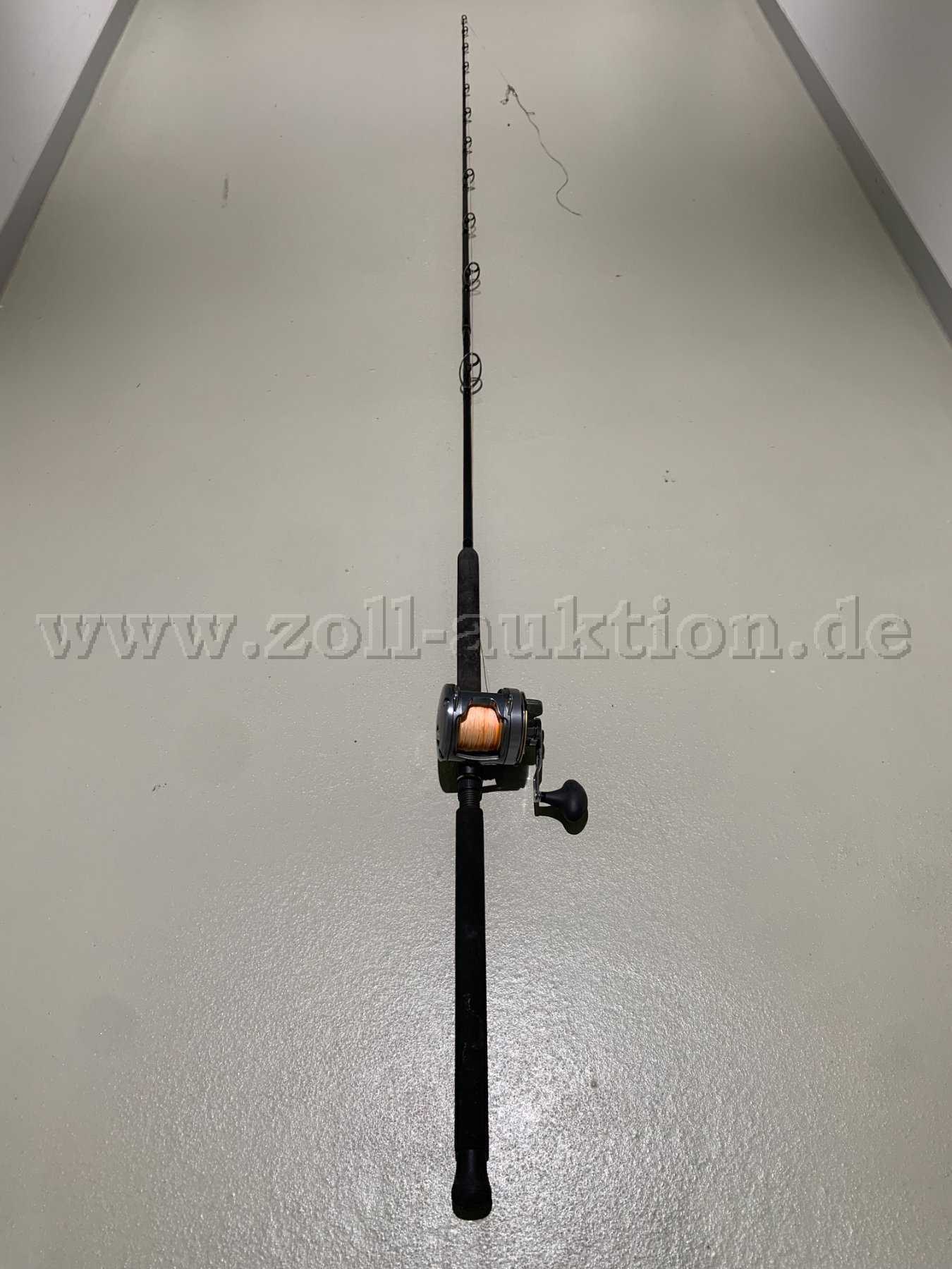 Beschreibung/Zustand: schwarz mit dickem Griffpolster, mit Spule und Angelschnur (rosa), gebraucht, leichte Schmutz- und Gebrauchsspuren (Kratzer auf der Spule, Erddreckflecken unten am Griff)
