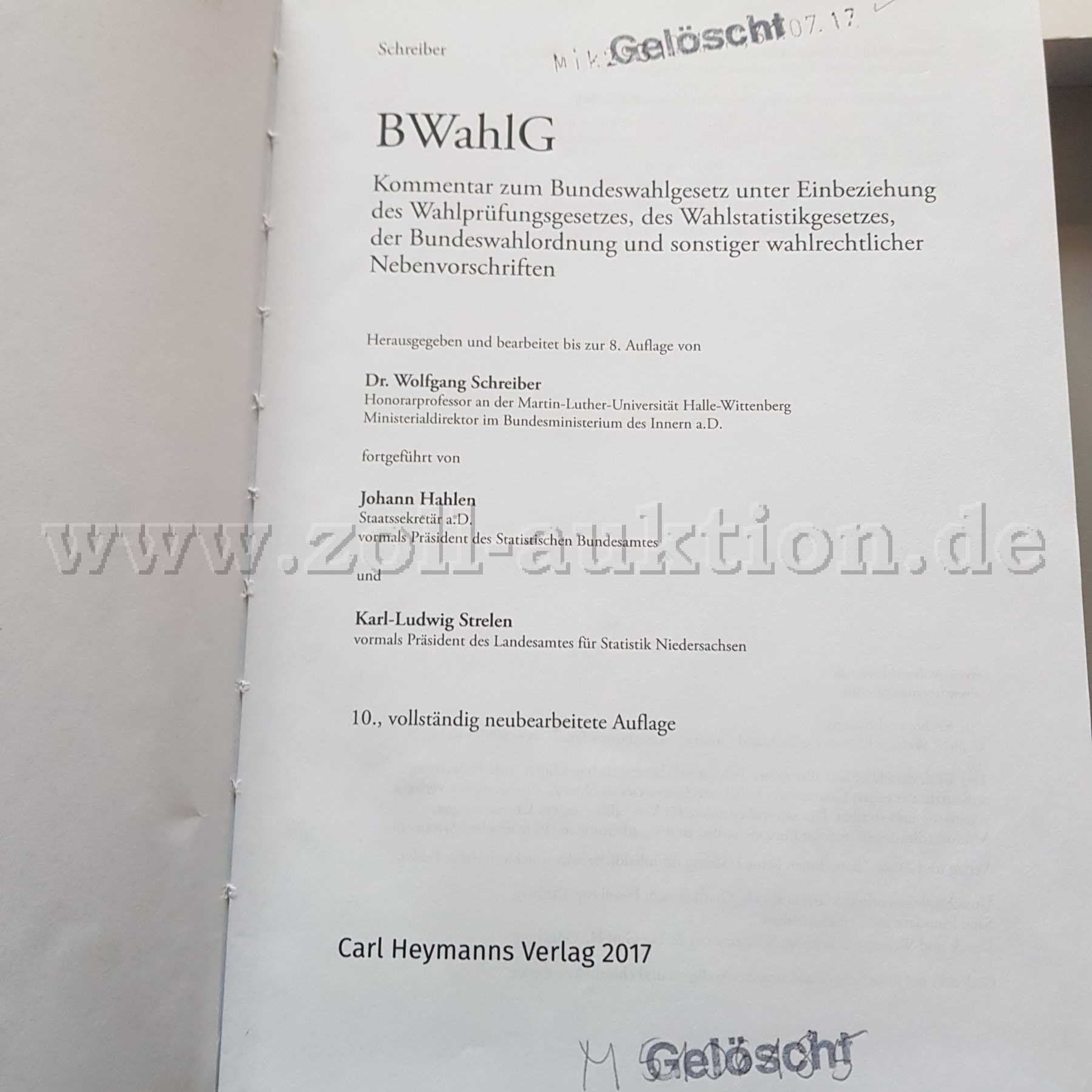 BWahlG : Kommentar zum Bundeswahlgesetz unter Einbeziehung des Wahlprüfungsgesetzes, des Wahlstatistikgesetzes, der Bundeswahlordnung und sonstiger wahlrechtlicher Nebenvorschriften / herausgeben und bearbeitet bis zur 8. Auflage von Dr. Wolfgang Schreiber ; fortgeführt von Johann Hahlen und Karl-Ludwig Strelen. - 10., vollständig neubearbeitete Auflage. - Köln : Carl Heymanns Verlag, 2017. - CX, 1058 Seiten