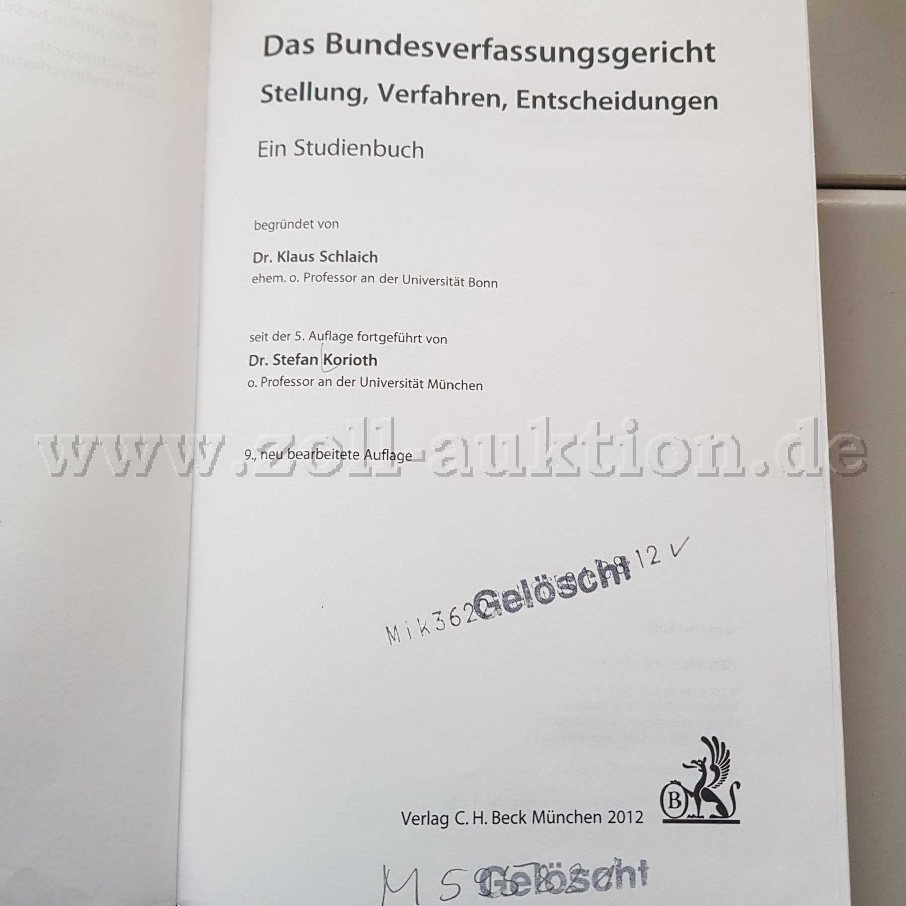 Das Bundesverfassungsgericht : Stellung, Verfahren, Entscheidungen : ein Studienbuch / begründet von Dr. Klaus Schlaich, seit der 5. Auflage fortgeführt von Dr. Stefan Korioth. 9., neu bearbeitete Auflage. - München : C.H. Beck'sche Verlag, 2012. - XIII, 414 Seiten