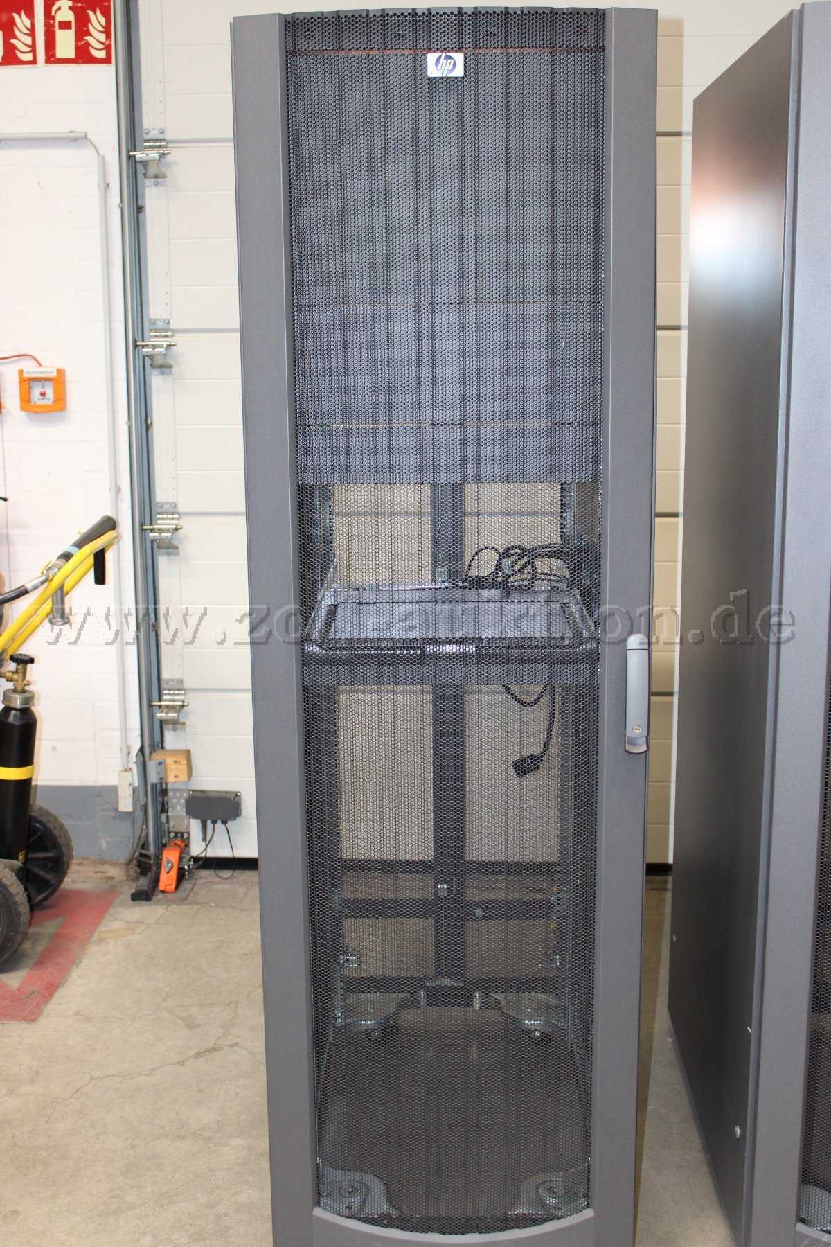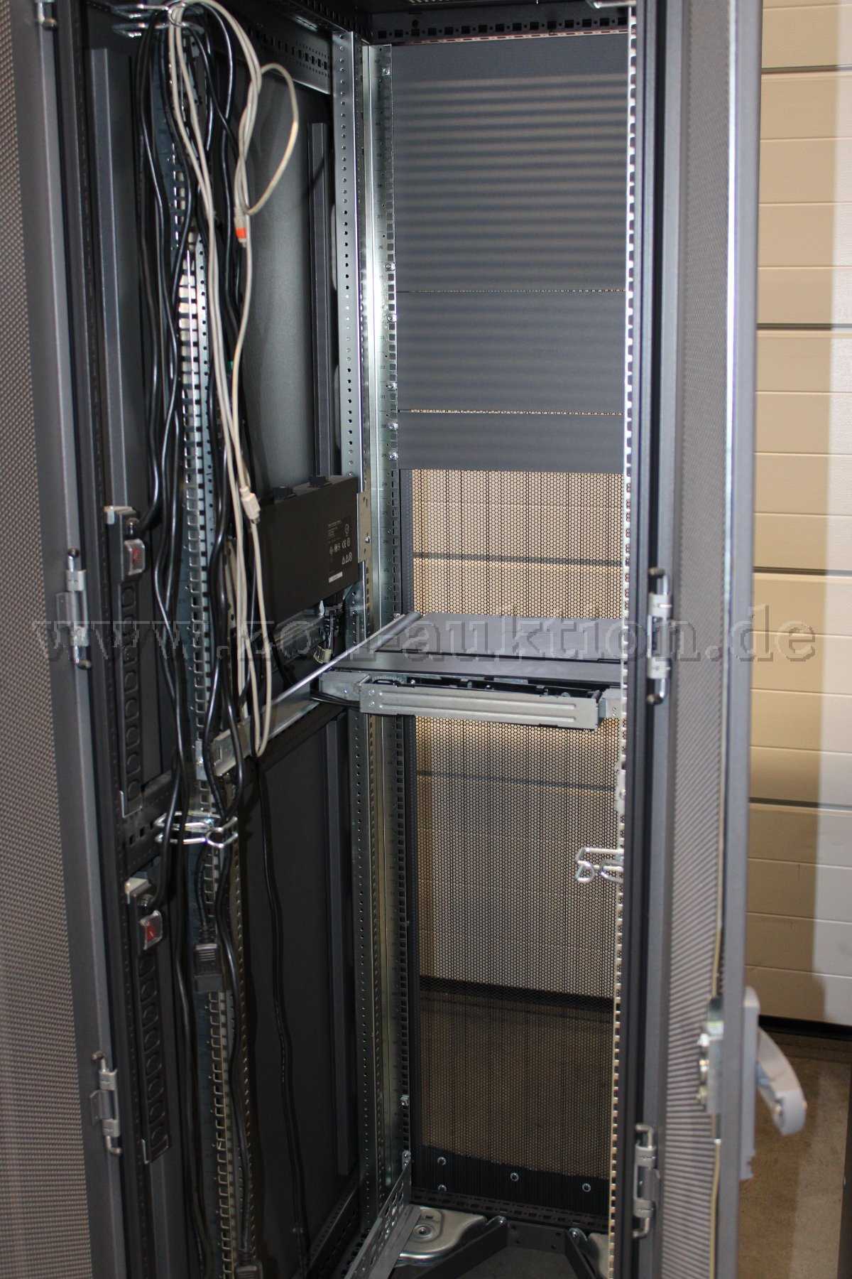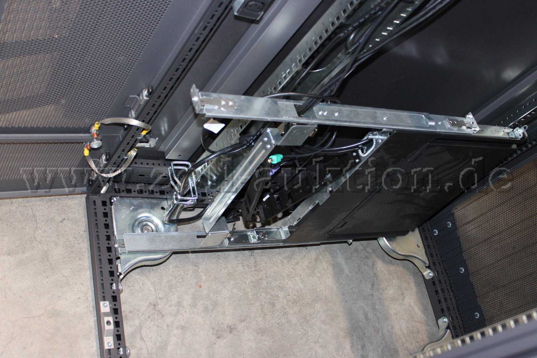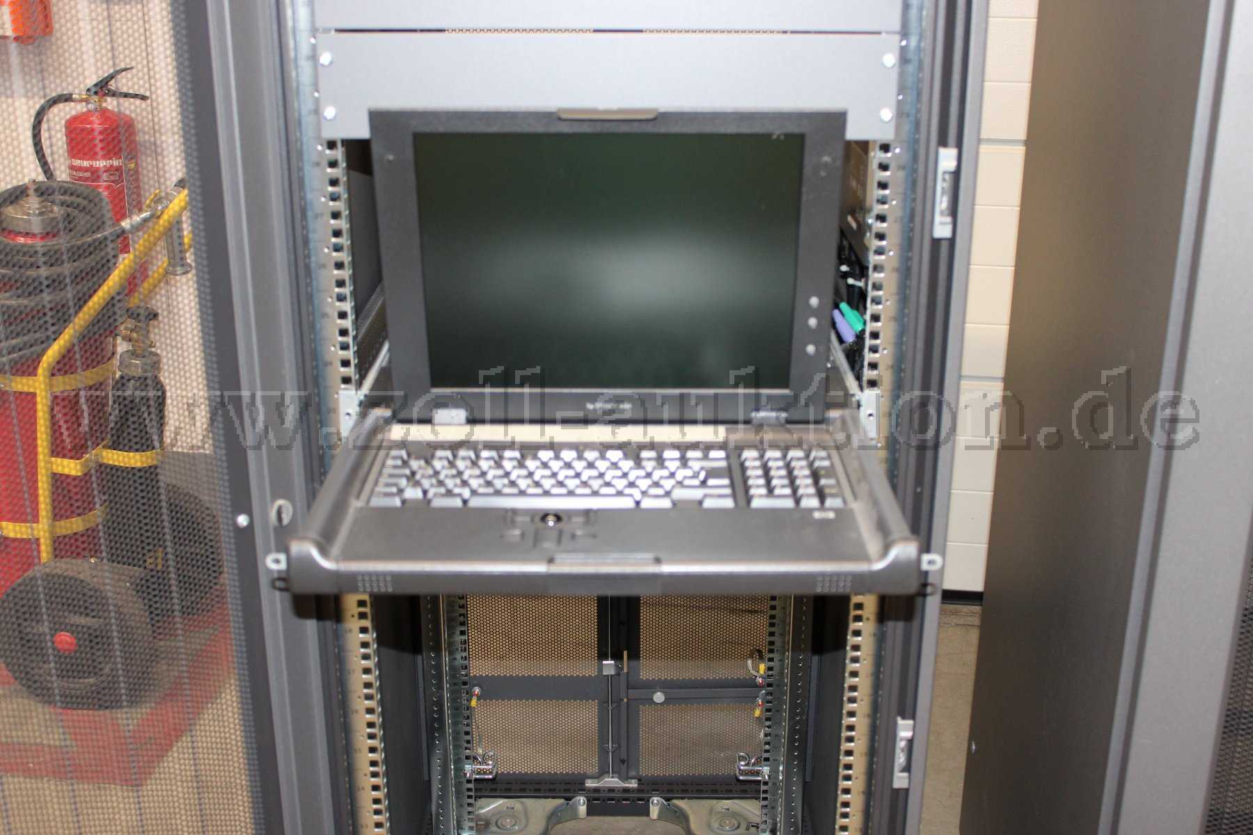 - KVM Konsole: Die Konsole dient nur zur Bedienung der Server. Platzsparende Bauweise, diese Konsole ist auf einem ausziehbaren Einschub montiert, der bei Nichtgebrauch wie eine Schublade im Schrank verschwindet.