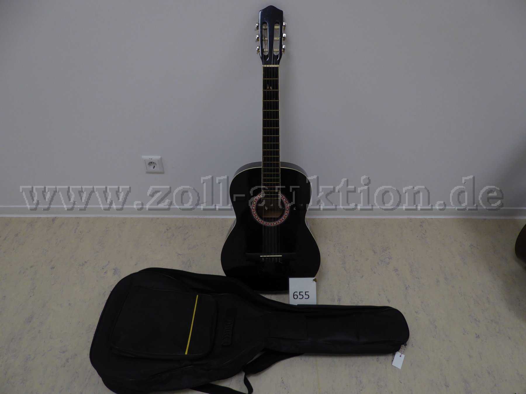 - 1 x akustische Gitarre in Schwarz von Almeria mit Nylon Saiten und Tragetasche Schwarz mit Reißverschluss.