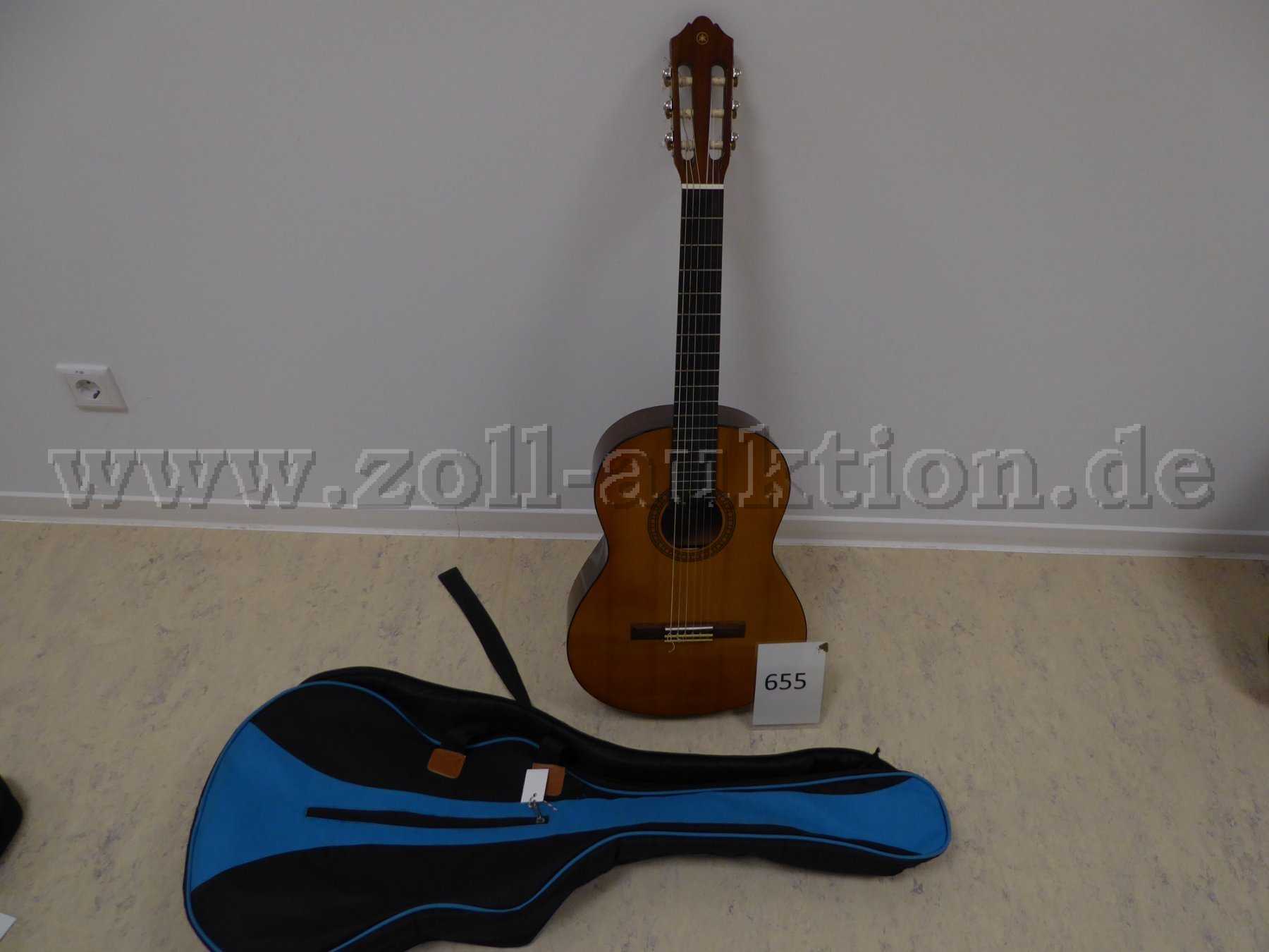 - 1 x akustische Gitarre in Braun von Yamaha mit Nylon Saiten und Tragetasche Schwarz / Blau mit Reißverschluss.