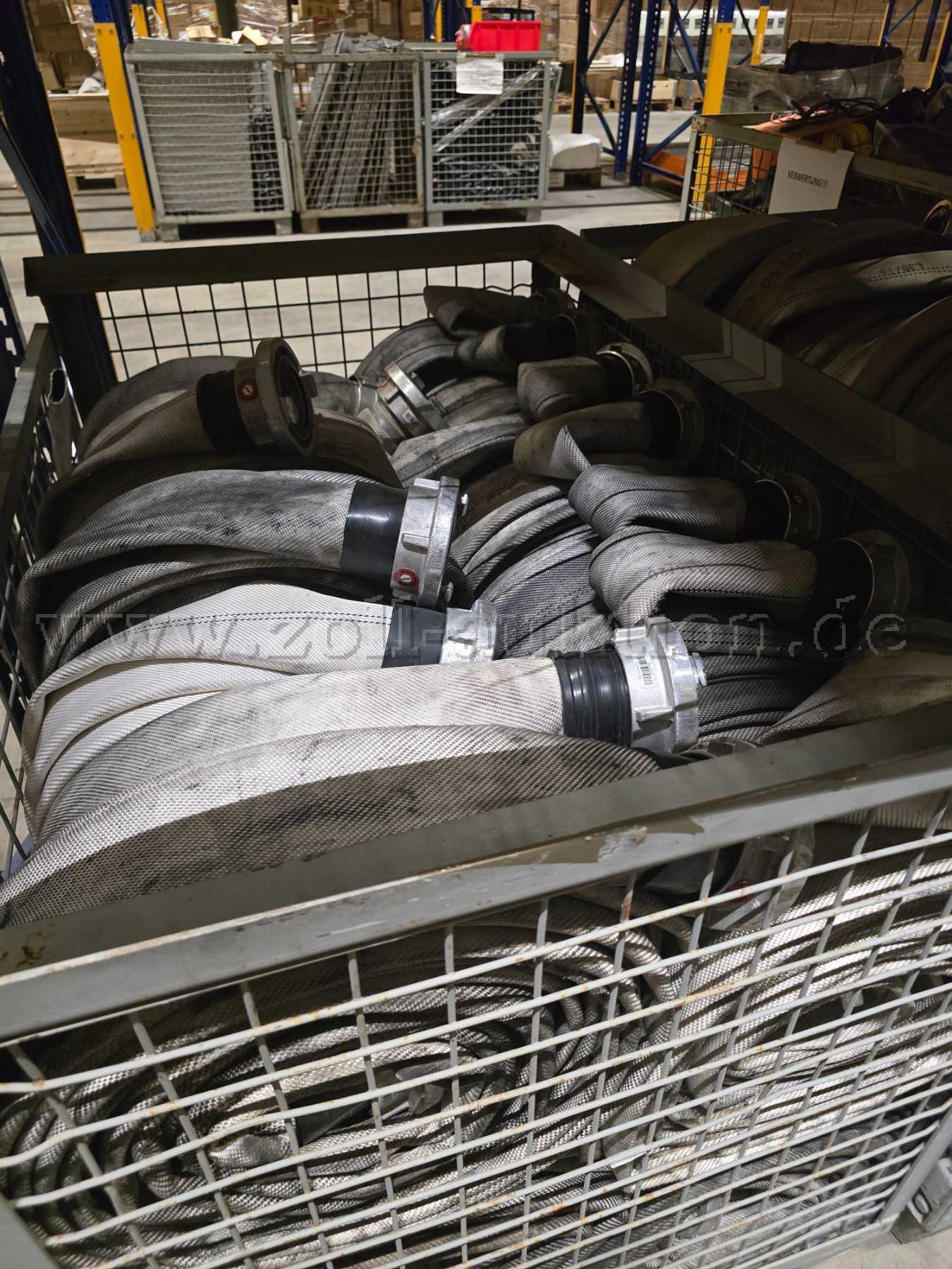Angeboten wird eine Gitterboxenfüllung Feuerwehrdruckschläuche der Größen C mit 52 mm Innendurchmesser und einer Länge von 15 Metern.