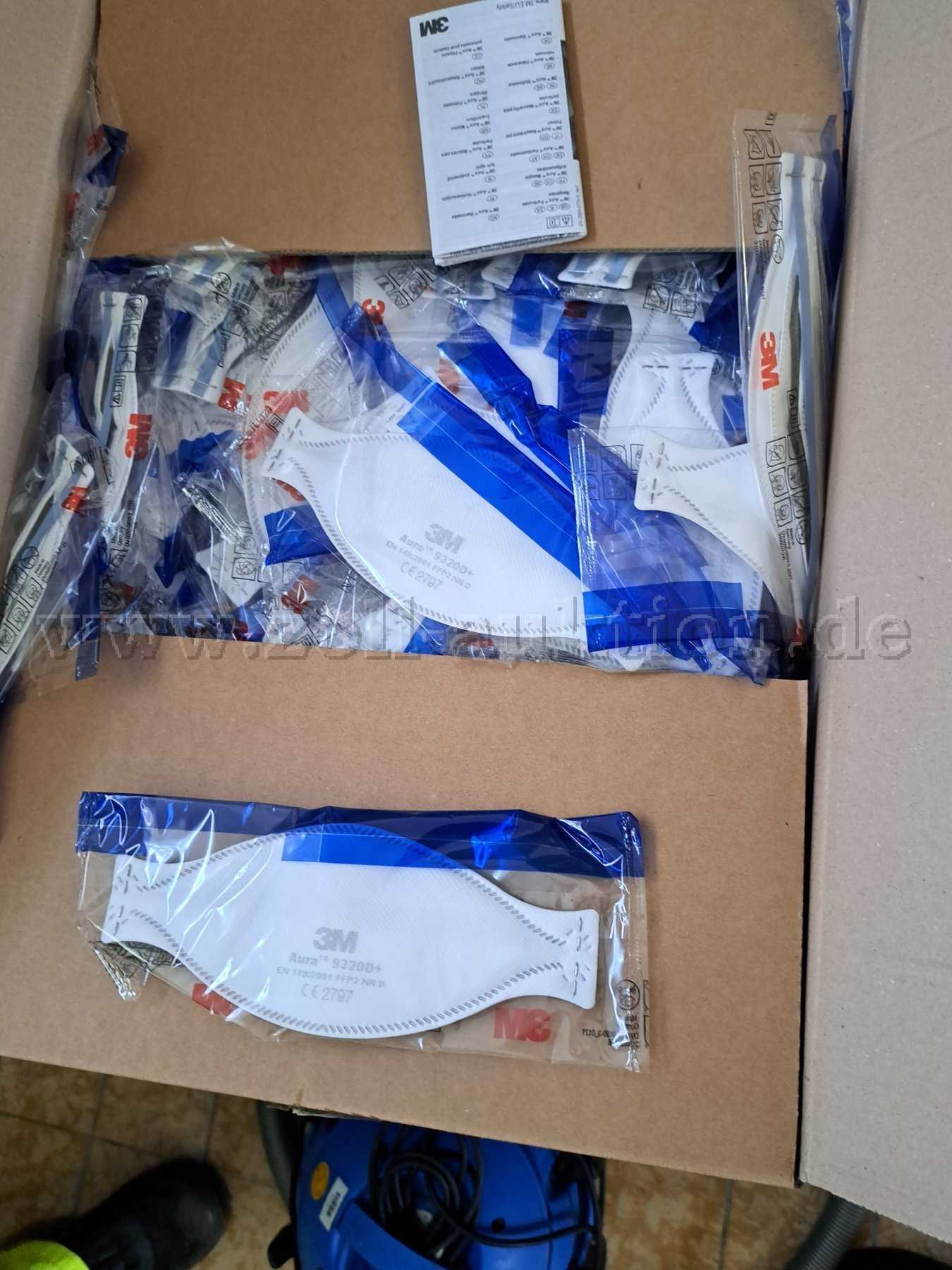 Es handelt sich um 3M Aura FFP2 Masken (Modell 9320D+), jeweils hygienisch in Folienverpackung eingeschweißt.
